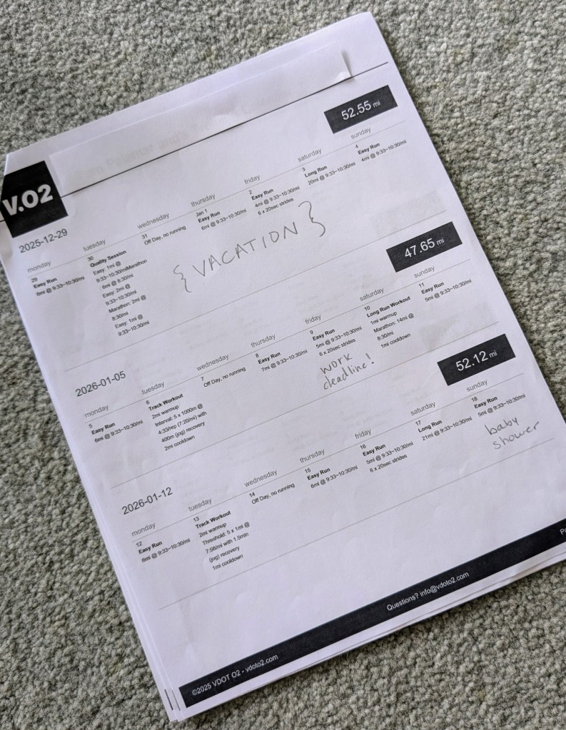 Feel free to move some of your runs around to accommodate your fluctuating schedule. Just try not to schedule two back to back “hard” days (such as speed work and long run) if possible. You can also split some of the runs if time is an issue. Maybe while on vacation, you can’t fit your hour long Thursday run in, but a 30 minute run on Thursday followed by a 30 minute run on Friday would work much better. And if you need to miss a day of training here and there, it is not the end of the world. You won’t lose your fitness by a missed run or two.